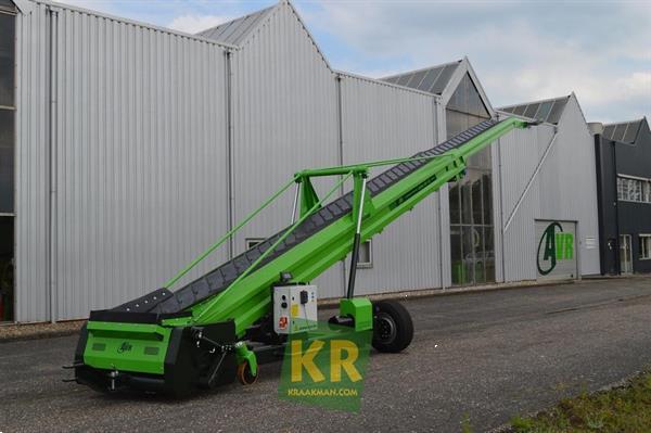 trekhaak met dubbele lip, makkelijk demonteerbaar PU zwenkbare steunwielen voor transport Zwenkt op de banden: (285/70-R19.5) * beide hydraulische aangedreven, met ontkoppeling voor vrijloop bij transport * van transport naar zwenkposities wielen d.m.v. hydraulische cilinder Stempel (Ø 280mm) Rubber instorttrechter Rubberen transportband ondersteund door rollen in trogvorm Chevron profiel (15mm) met goed meeneemeffect voor aardappelen 'Meelopende' zijwanden 80‐17 / 80‐19: Aandrijving d.m.v. 2 VanderGraaf trommelmotoren (2 x 4kW) 80‐15: Aandrijving d.m.v. 1 VanderGraaf trommelmotoren (1 x 5,5kW) Trommelmotoren met lichte bolling & bekleed op de trommel Automatisch stuursysteem band Schraper op keerrol en insnoerrol trommelmotor boven en onder V-schraper in band Verstelbare (0-20°) knik boven (L 1,50m) Hydraulisch : Pompgroep voor aandrijving wielen (proportioneel), zwenk rijpositie, band op/neer Elektrisch : Noodzakelijke stroomvoorziening 3x400V + PE, 50/60HZ, 32A Elektromotoren voor aandrijving hydro-unit (2,2kW), band (trommelmotoren), in/uitschuiven Frequentieregelaars voor bandaandrijving Sensoren: Encoder op draaipunt -> vastleggen teach-punten Inductieve sensor: meten eindeloop in-en uitschuiven Druksensoren: voedingsdruk & wielmotoren Bediening : Elektrische kast met inkomende 32A stekker + fasewisselaar * functies: start-stop & reset (met lichtindicatie), noodstop, buzzer * LC: 13-polige stekker voor koppelen met andere machines 5" Touch-display en bekabelde keypad (10m) 5" Display voor alle bedieningen, informatie & foutcodes Keypad: 15 functies + noodstop: * band on/off, snelheid band, band op/neer, band in/uit, manueel/auto., zwenk rijpositie, zwenken links/rechts, rijden linkerwiel/rechterwiel - voor/achter, teachposities en een keuzetoets Automatische functie standaard machine: Begrenzing links rechts door instellen van teach-punten Wachten en inschuiven aan teach-punt Veiligheid door overdruk op wielmotoren 17 m lengte, 0,80 bandbreedte Koppeldeel voor duoband Rubberen ringen op alle rollen Toevoerband (1250 mm). Meegeschakeld met band, -15% +15% snelheid t.o.v. hoofdband. Optie dubbele PU wieltjes incl. 2 LED werklampen op top vast deel elevator Radiografische afstandsbediening met noodstop (tiger) AUTO II (wand-en productdetectie + hoogtemeting) Sterke punten: Vriendelijk in gebruik en onderhoud. Zachte behandeling van de oogst door minimale valhoogte en gelijkmatige toevoer van de aardappelen. Semi-automatisch vullen dankzij sensoren.