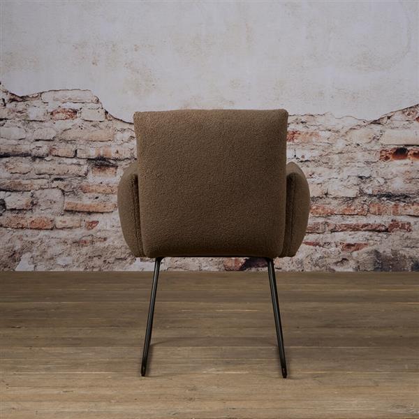 Deze bruine eetkamerstoel is gestoffeerd met een teddy stof, die net zo zacht voelt als dat hij oogt. Dante komt uit de stoelencollectie van Tower Living. De teddy stof is door gestoffeerd tot onder de armleuningen. De metalen U-poten zijn afgewerkt met een zwarte coating.