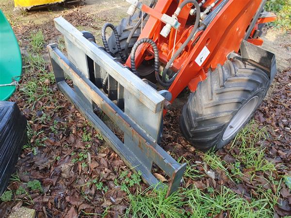 Mini shovel / Knikshovel 800 kg uitgerust met 18.5KW PERKINS 403D-11 motor. Hydrauliekslangbescherming, Hydraulische werktuig aankoppeling, Dubbel werkend ventiel, hefarm met dubbele hefcylinders. Ruw terrein banden. Aankoppelings plaat identiek aan Weidemann koppeling. Kieplast voertuig recht: 798kg Kieplast voertuig 68° geknikt: 498kg Operationeel gewicht: 1470kg Lengte: 3690mm, Breedte: 1050mm, Hoogte: 2300mm Min. bodemvrijheid: 200mm Max. kiep hoogte: 2000mm Wielbasis: 1340mm Hefsnelheid: 8s Rijsnelheid: 0-12km/u Verbruik: 252g/kw/uur.