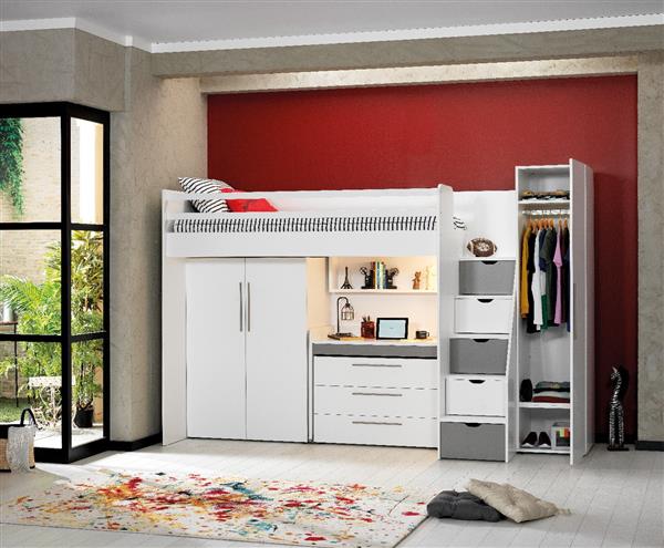 Door het bureau onder de hoogslaper te plaatsen en daar bijvoorbeeld weer de ladekast onder te schuiven, wordt volop gebruik gemaakt van alle ruimte onder het bed!
