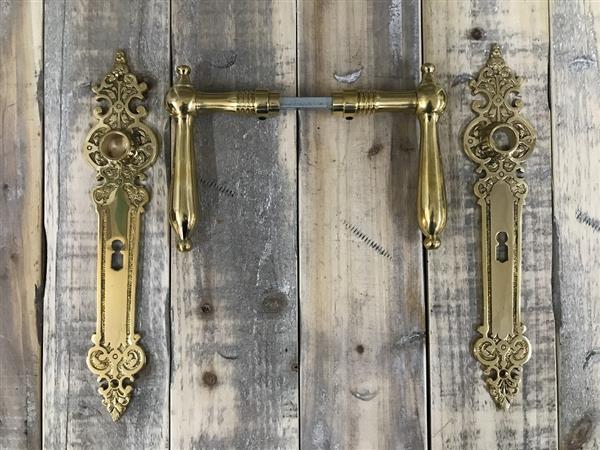 Prachtige set deurbeslag, bestaande uit een set deurklinken en twee lange deurplaten BB 72 voor kamerdeuren en een krukstift, volledig gemaakt van gepolijst messing.
