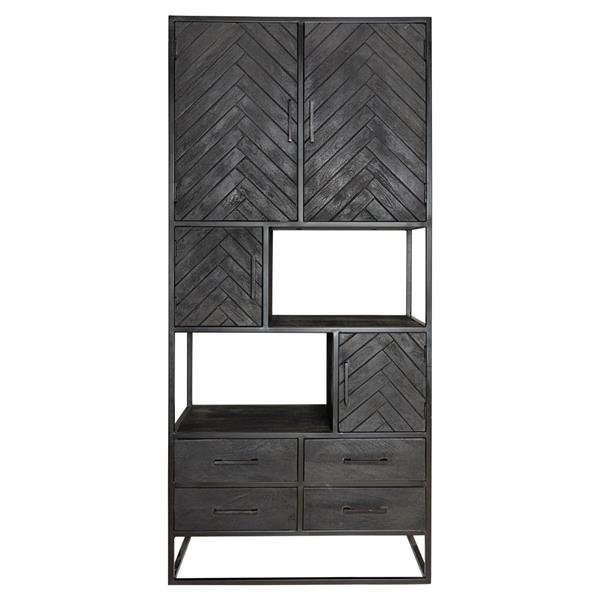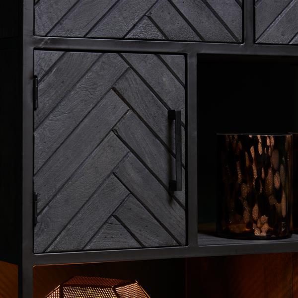 Onderhoud: Afnemen met een lichtvochtige doek.Deze vakkenkast uit onze 'New York serie' heeft vier lades, vier deuren en twee vakken en is uitgevoerd in een visgraatpatroon. Achter de twee lange deuren vind je nog een extra legplank. De vakkenkast is gemaakt van gezandstraald mangohout en is afgewerkt met een zwarte lak. Het frame en de handgrepen zijn gemaakt van metaal en afgewerkt met een zwarte lak.