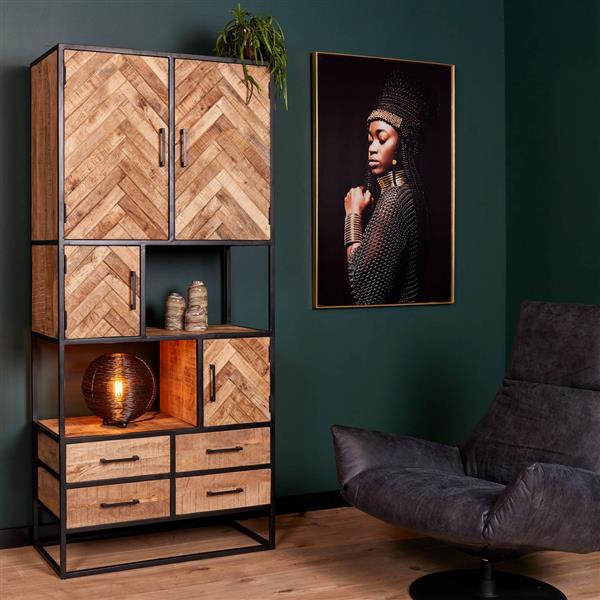 Deze vakkenkast uit onze 'Arlington serie' heeft vier lades, vier deuren en twee vakken en is uitgevoerd in een visgraatpatroon. Achter de twee lange deuren vind je nog een extra legplank. De vakkenkast is gemaakt van mangohout en is afgewerkt met een lak. Het frame en de handgrepen zijn gemaakt van metaal en afgewerkt met een zwarte lak.