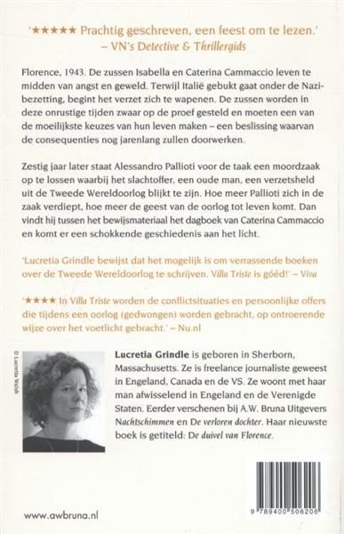Titel: Villa triste Auteur: Lucretia Grindle ISBN: 9789400506206 Conditie: Used ' ***** Zelden verdient een boek het predicaat literaire thriller, dit keer is het volkomen verdiend. Prachtig geschreven, op vrijwel elke pagina wel een verrassend beeld en een verhaal dat staat als een huis. (…) Een dermate ingenieuze plot dat Villa Triste (…) ondanks de af en toe gruwelijke gebeurtenissen een feest is om te lezen.' - VN DETECTIVE EN THRILLERGIDS 2013 'Krachtige karakterschetsen met Florence als prachtige achtergrond en een knappe intrige die heel wat historisch onderzoek vergde, zorgen voor vele uren leesplezier.' –